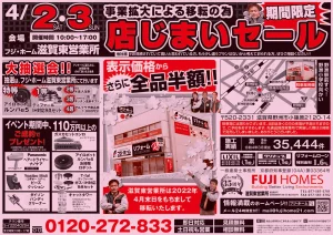 2022年4/2(土)・3(日)フジ・ホーム滋賀東店じまいセール