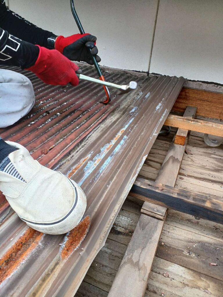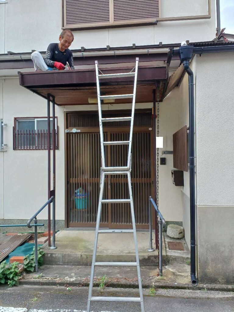 職人さんが、玄関ポーチの屋根に登って作業をしていたり、